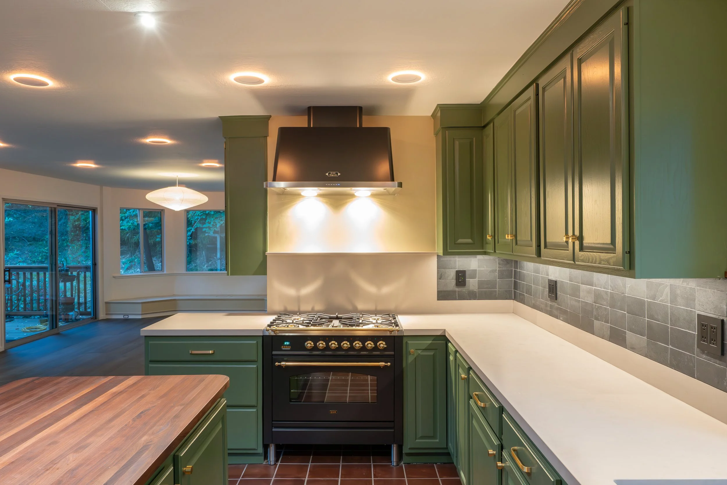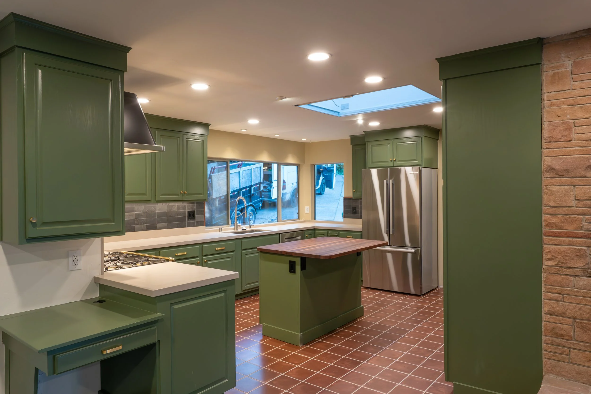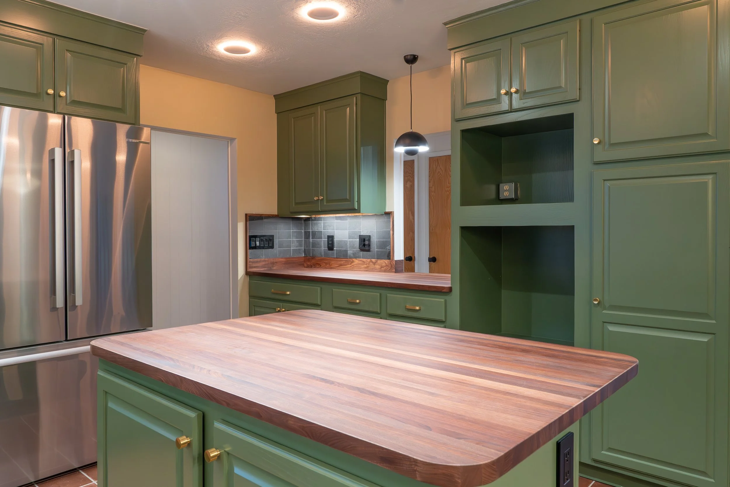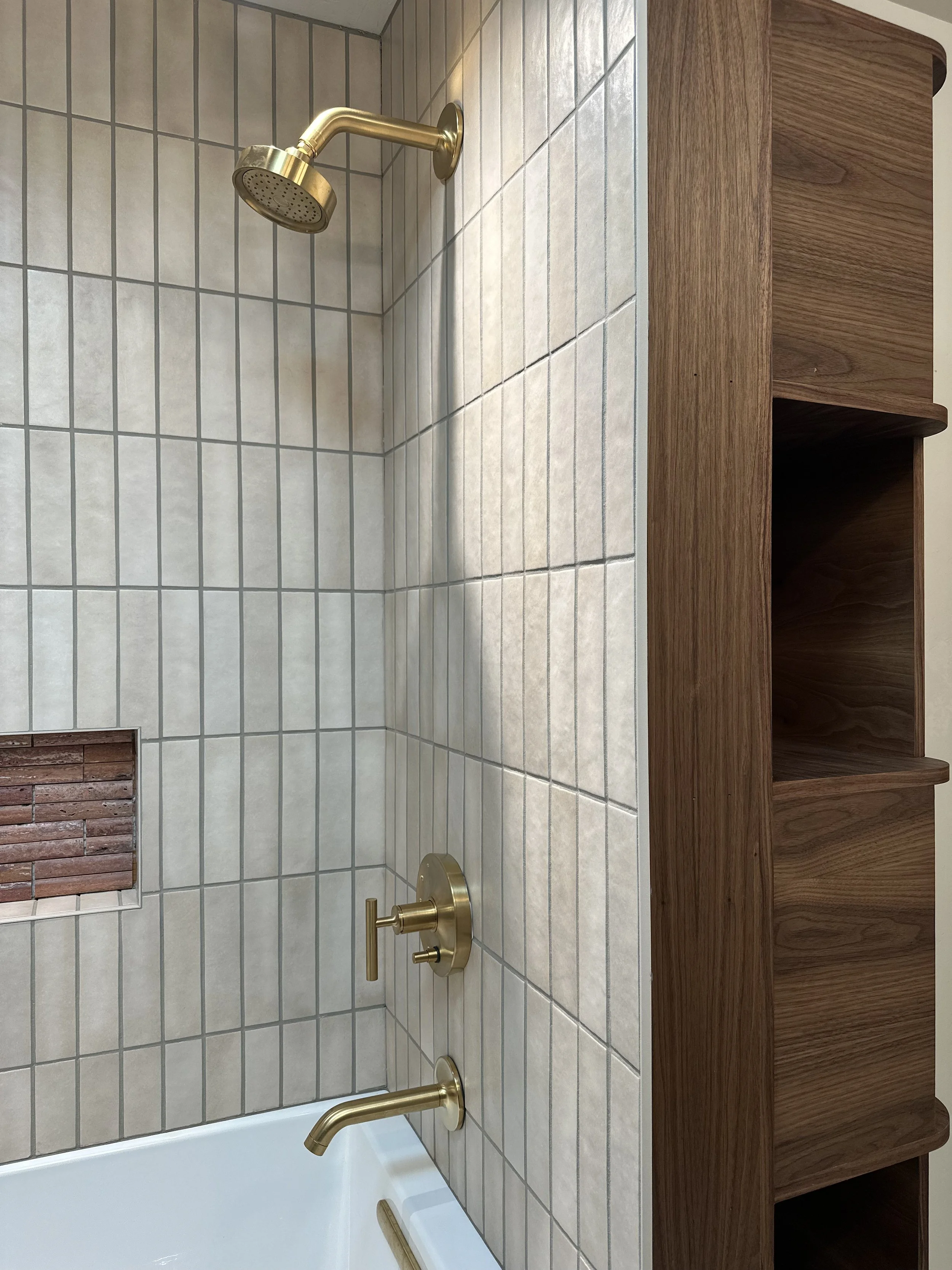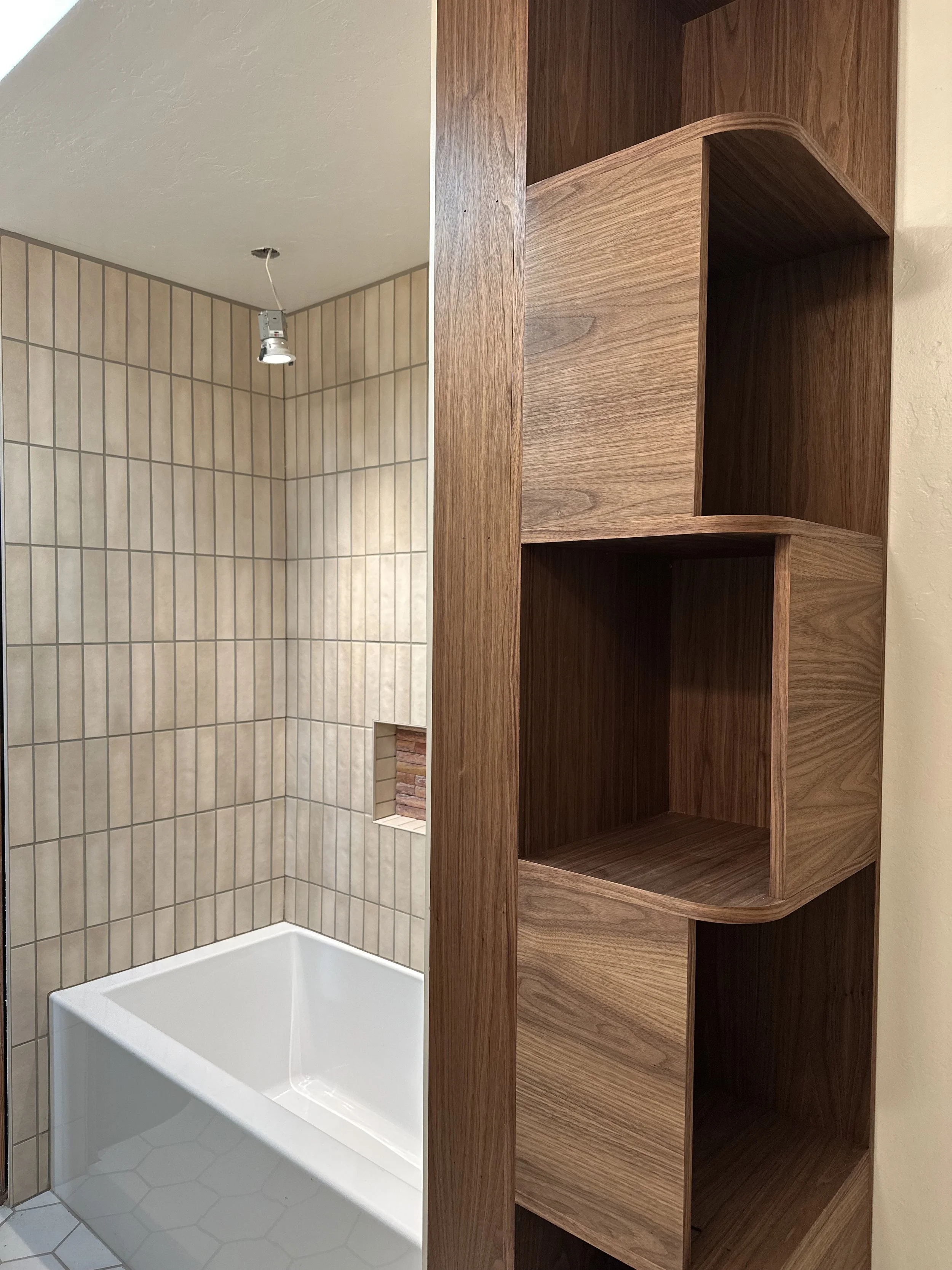 Full kitchen refresh with a fresh coat of paint on some 90’s oak cabinets, new appliances, undercabinet lighting, tile - and a full bathroom remodel featuring a custom walnut cabinet