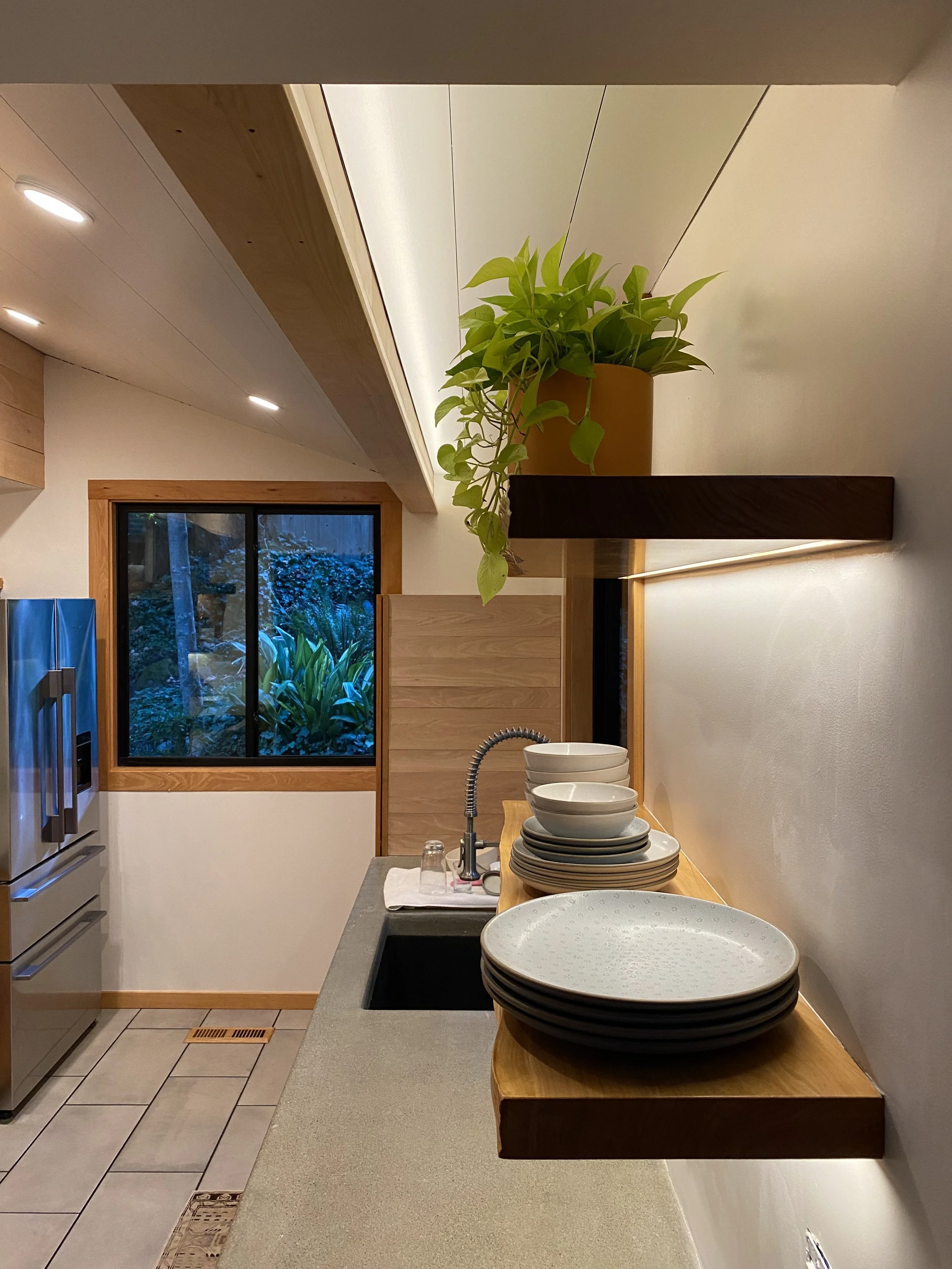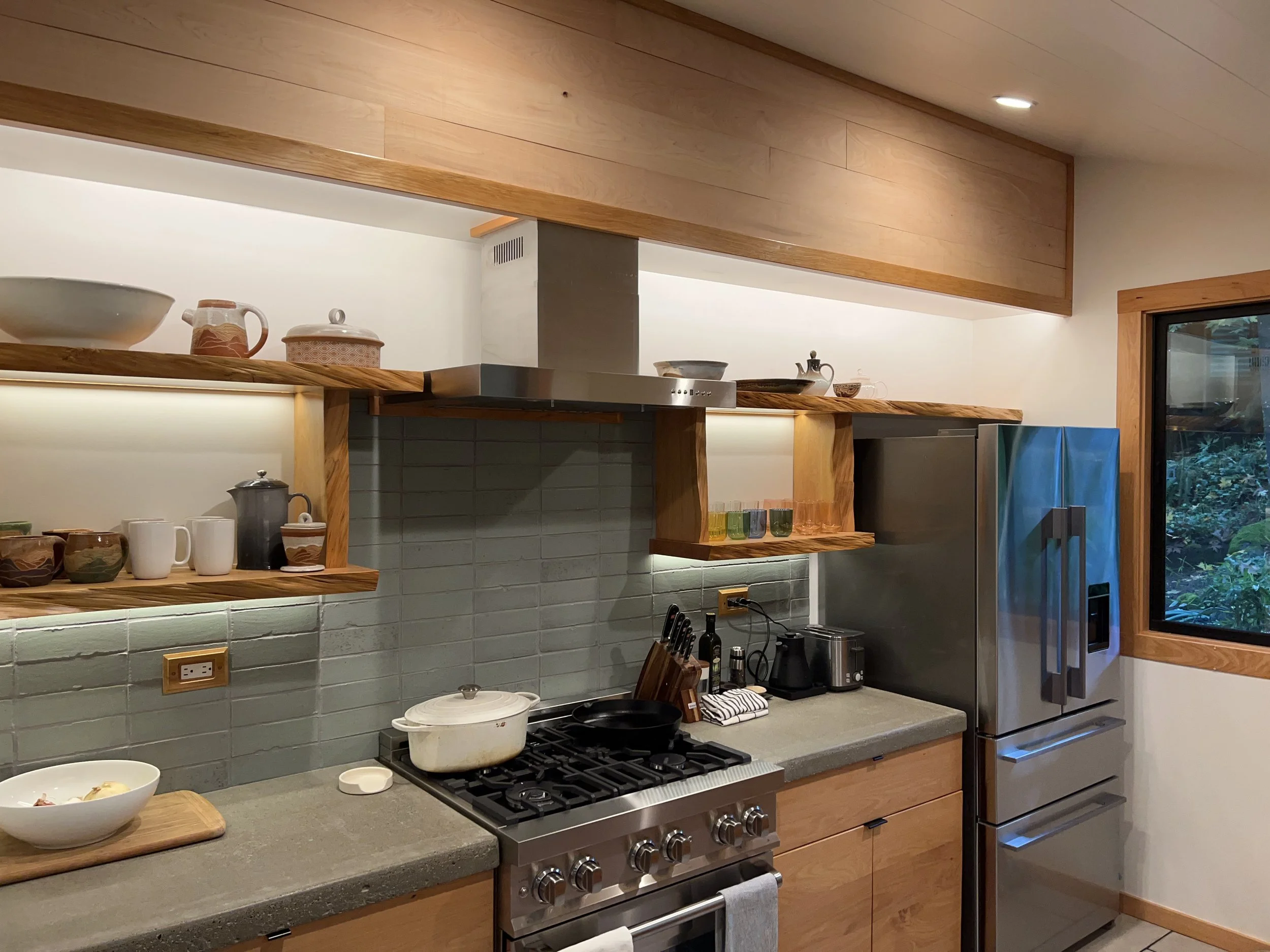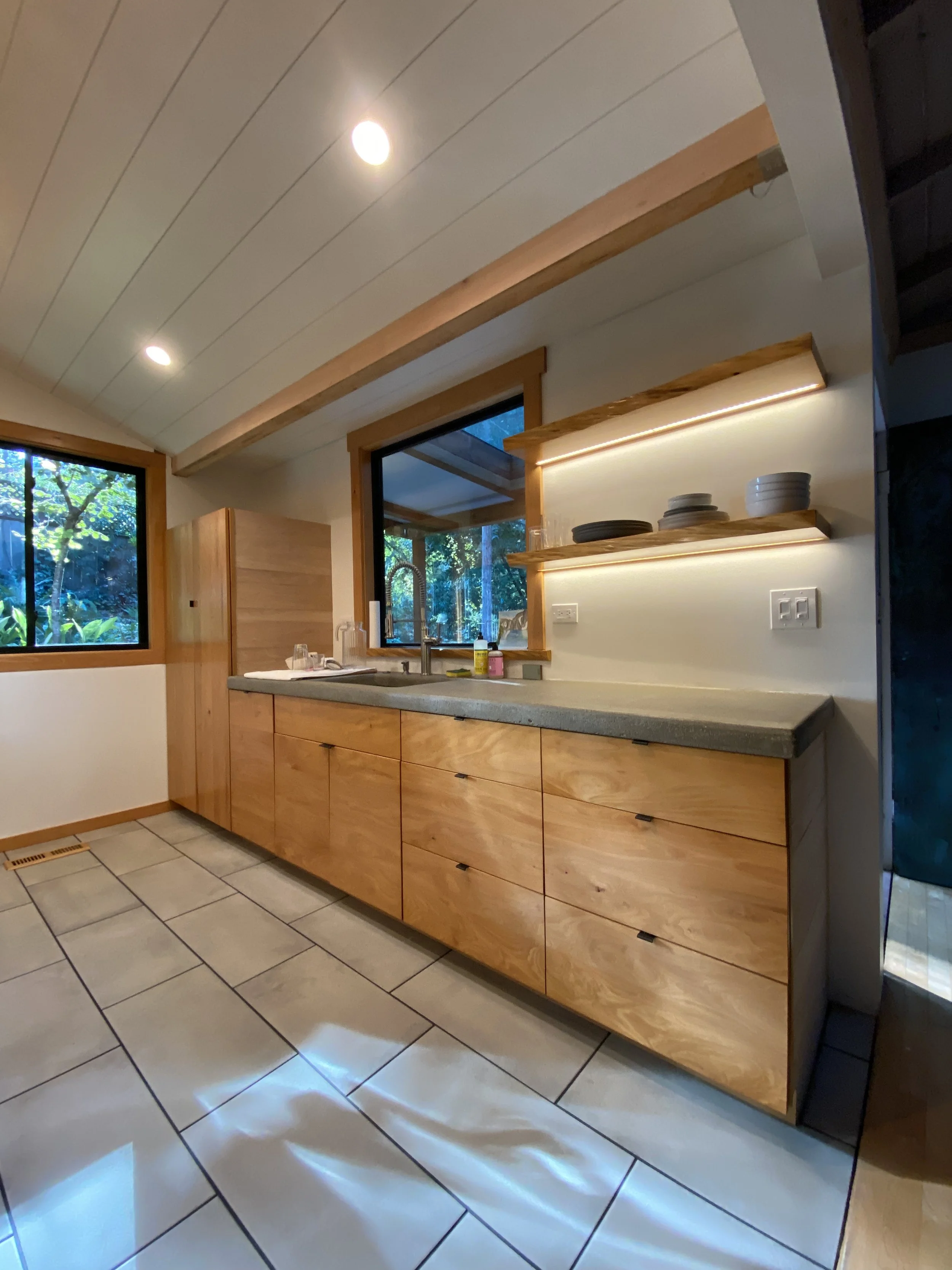 Design-build kitchen featuring in-house built cypress cabinets, concrete countertops, floating shelves