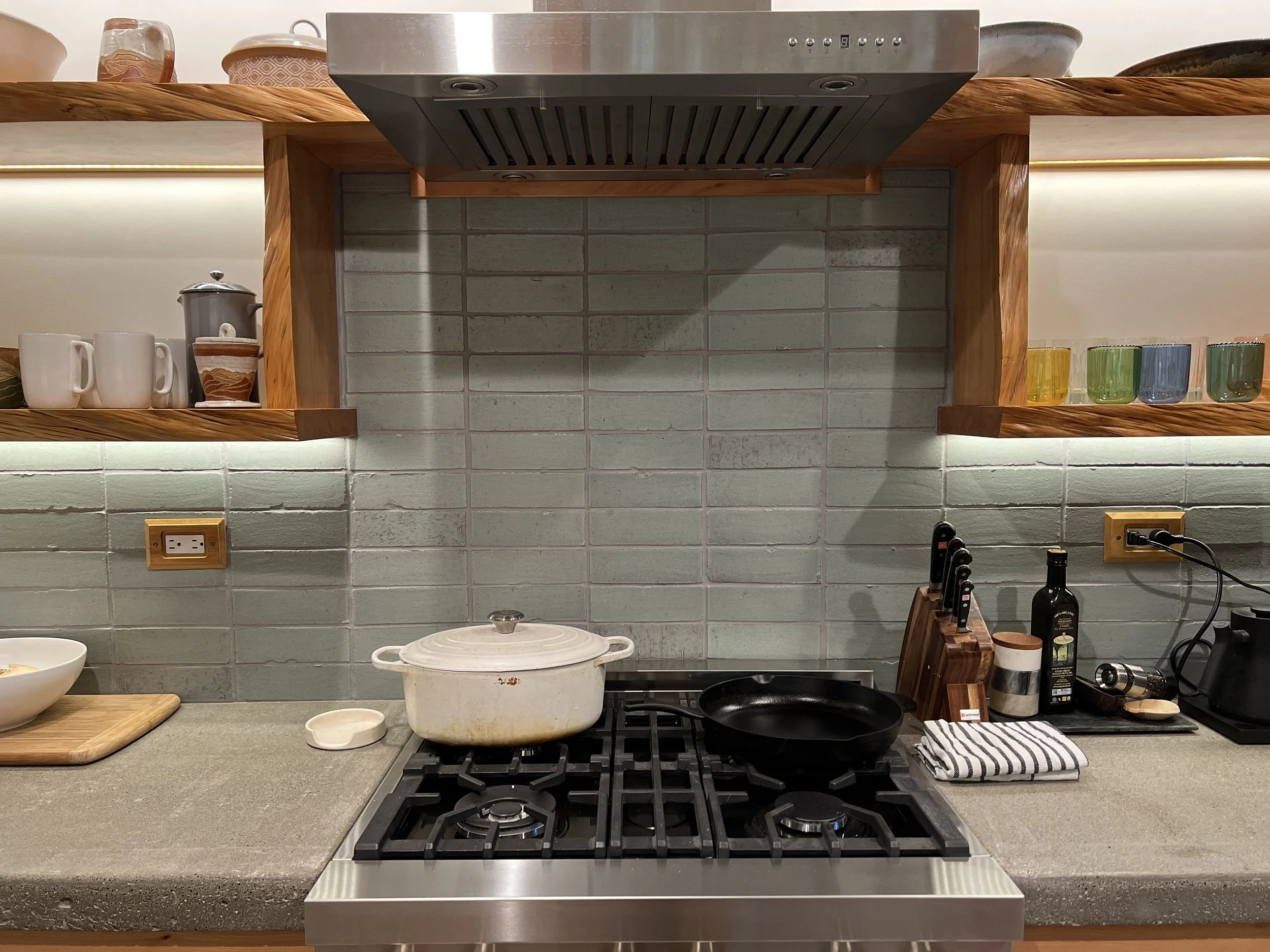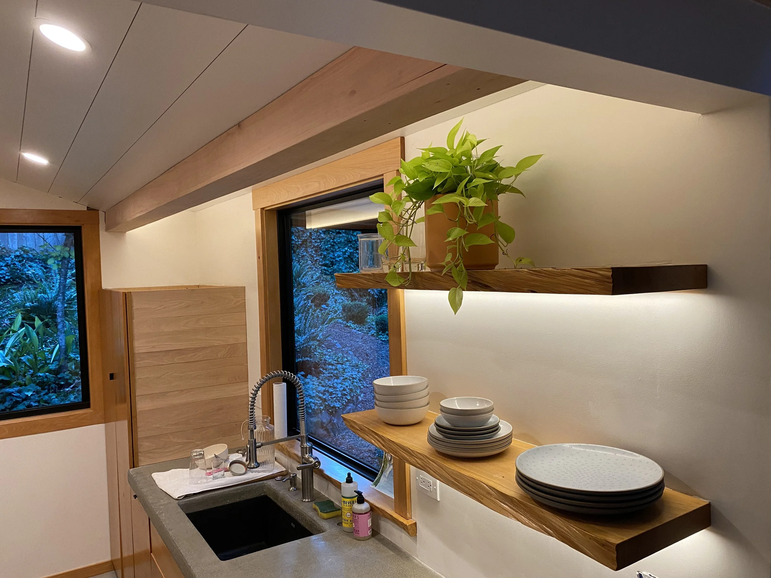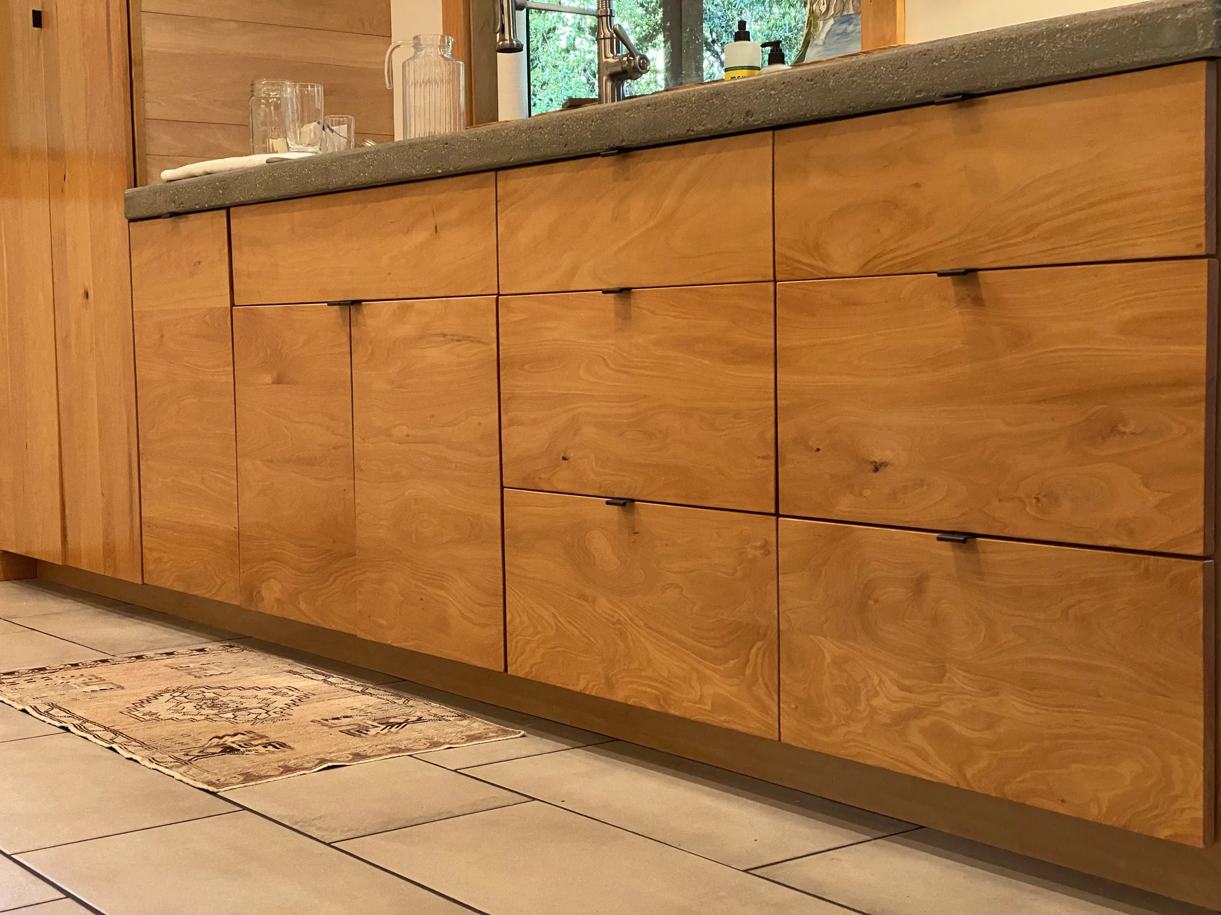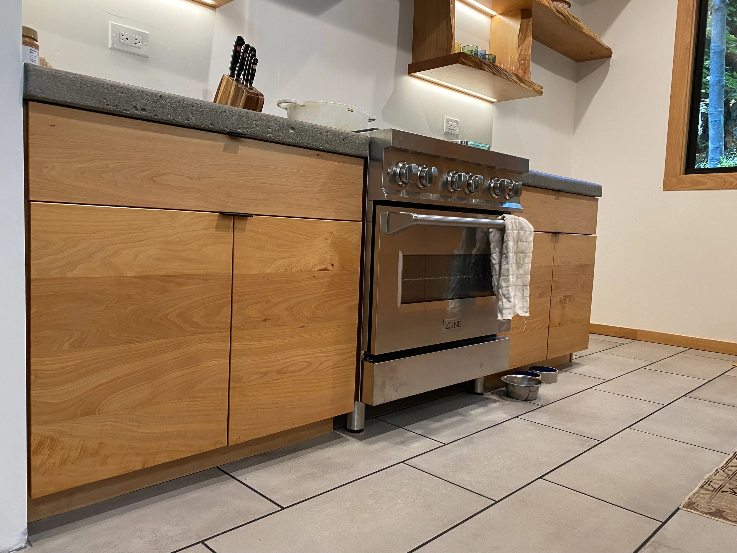 Design-build kitchen featuring in-house built cypress cabinets, concrete countertops, floating shelves